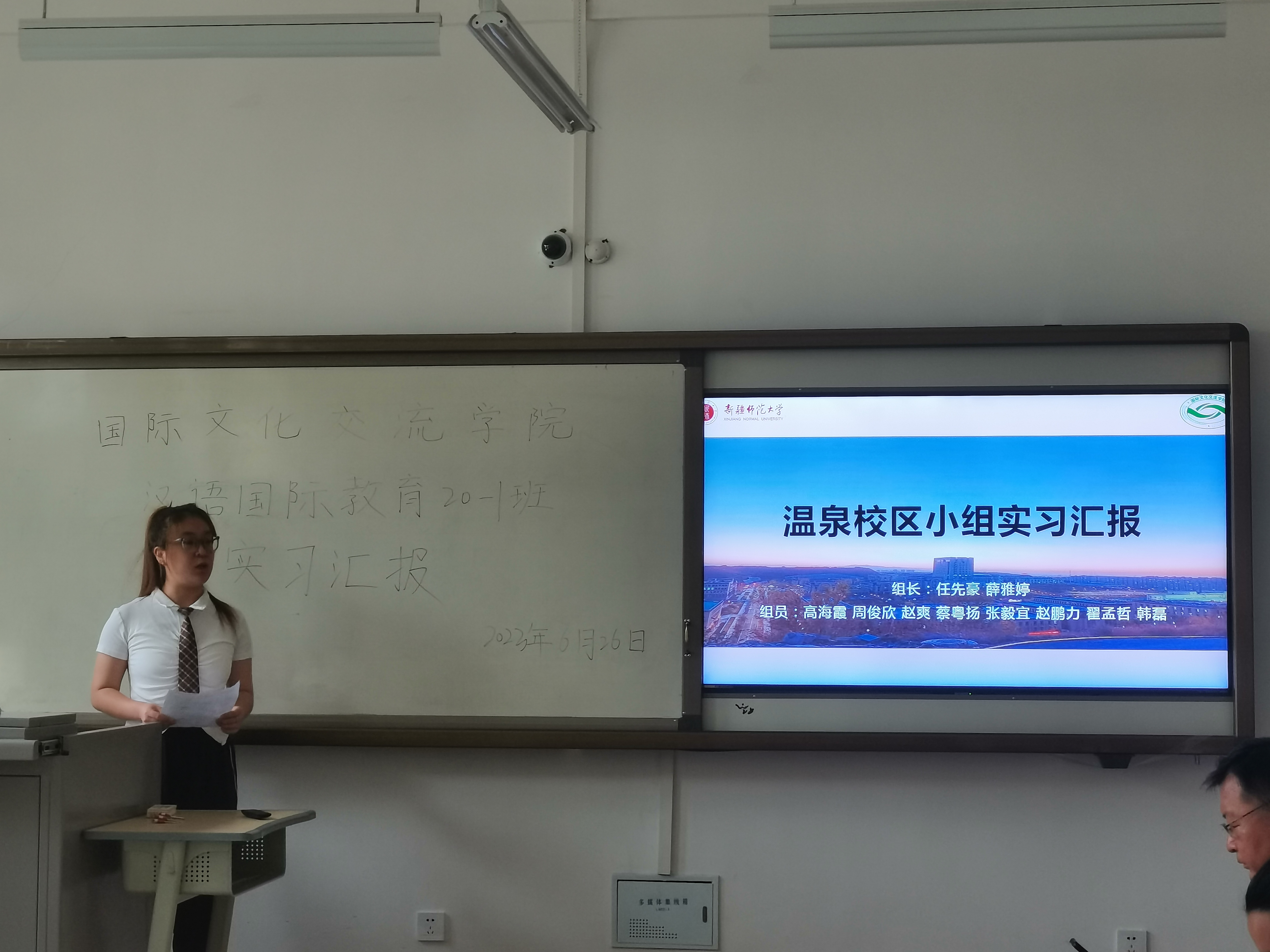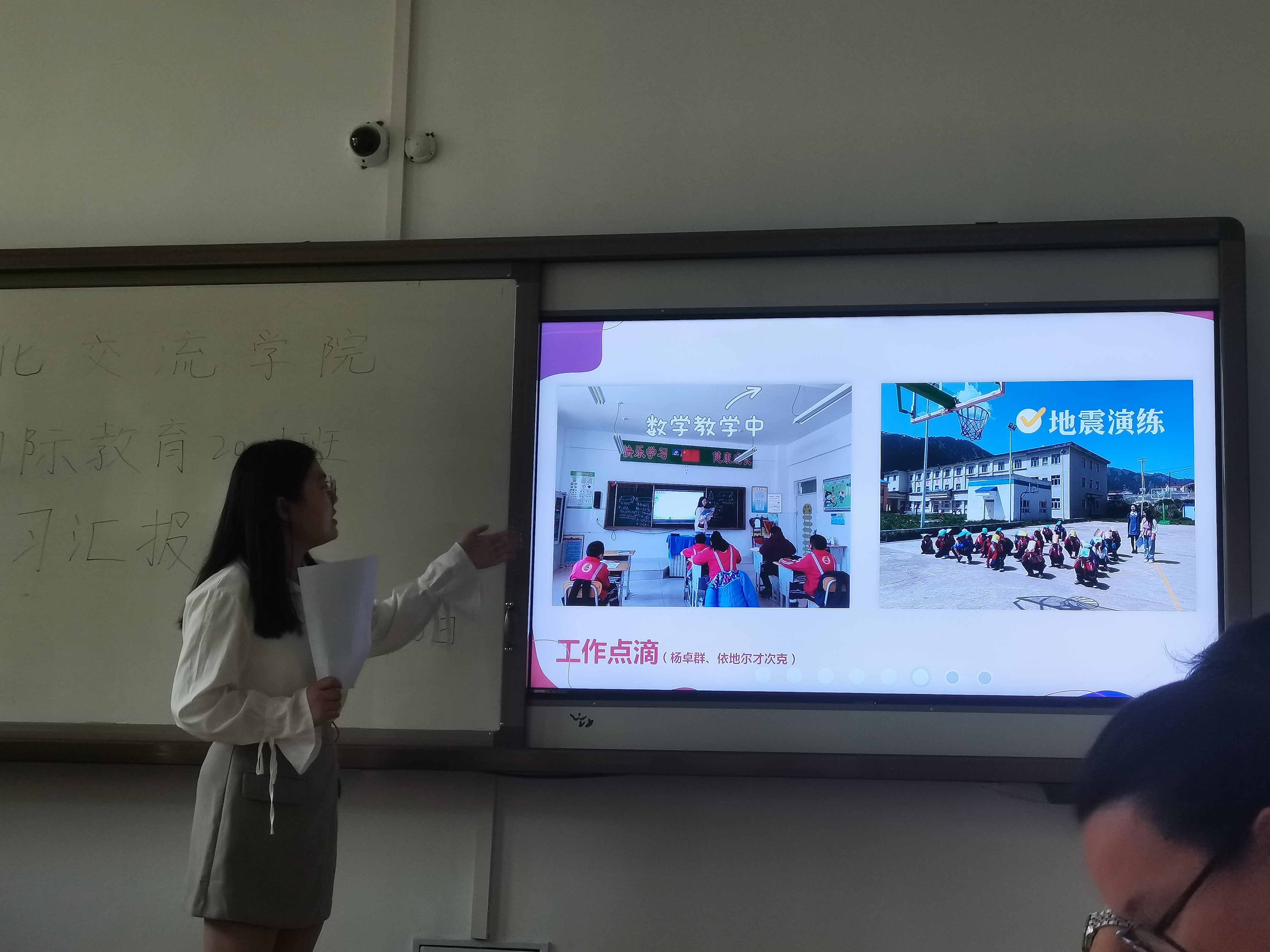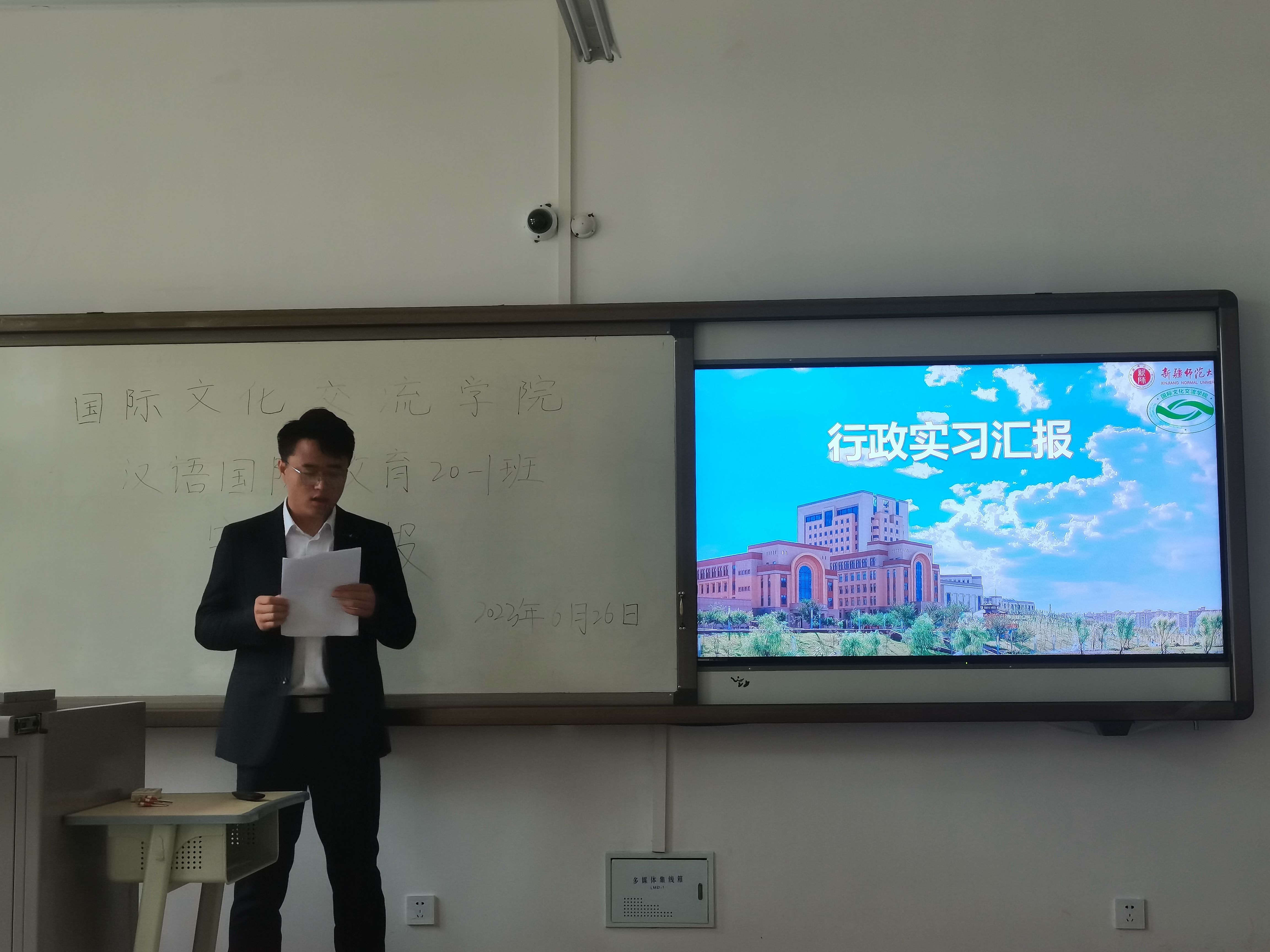 会议伊始,由各实习小组依次进行分组汇报。在院内实习的同学们充分利用学院专业优势和现有资源,与留学生结成语伴,认真听课观摩,课余进行一对一帮扶工作,通过晚自习作业辅导、共同参加中华传统文化社团学习、参与院内各项活动和比赛,有效提升了文化实践能力和教育教学技能;同时,他们还在学院行政办公室辅助老师开展各项工作,送文件材料、领取和清点物资、做各类表格和PPT、活动策划撰写、参与各项文化活动组织协调等,工作中他们始终保持着严谨认真的态度,努力做好每项工作,综合素质得到很大的锻炼提升。此外,他们还积极参加红色微课比赛、微党课比赛、俄语技能大赛以及青马班、胡杨班的培训学习,不断完善自己,为青春添上一抹亮丽的底色。