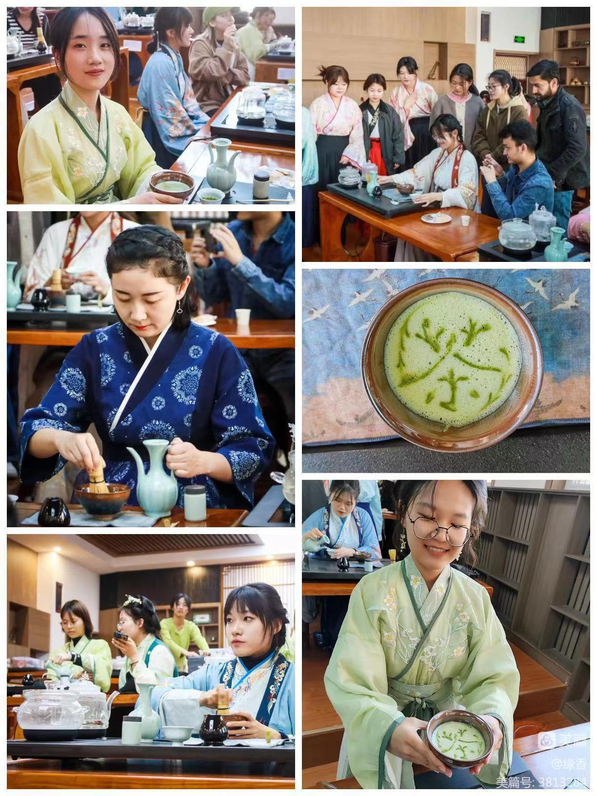 活动以《兰亭集序》的吟诵开场,之后学校茶韵文化社团成员进行点茶表演。嫩绿的齑粉在小茶艺师们的妙手点化之下变得深浅不同,茶碗中幻化篆字体的“茶”。中外学生一起奉茶、品茗、交流。在袅袅清香中,亚洲色情