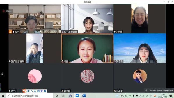 2022年4月18日晚,我院领导班子成员李嘉东书记、伊莉曼院长、刘伟乾副院长、学科带头人尹小荣博士和院办主任张丽老师通过线上会议的形式向在读博士闫丽、贺宏燕、汉语国际教育本科交换生蔡粤扬送上了温馨的问候和学院对他们的关心关爱。