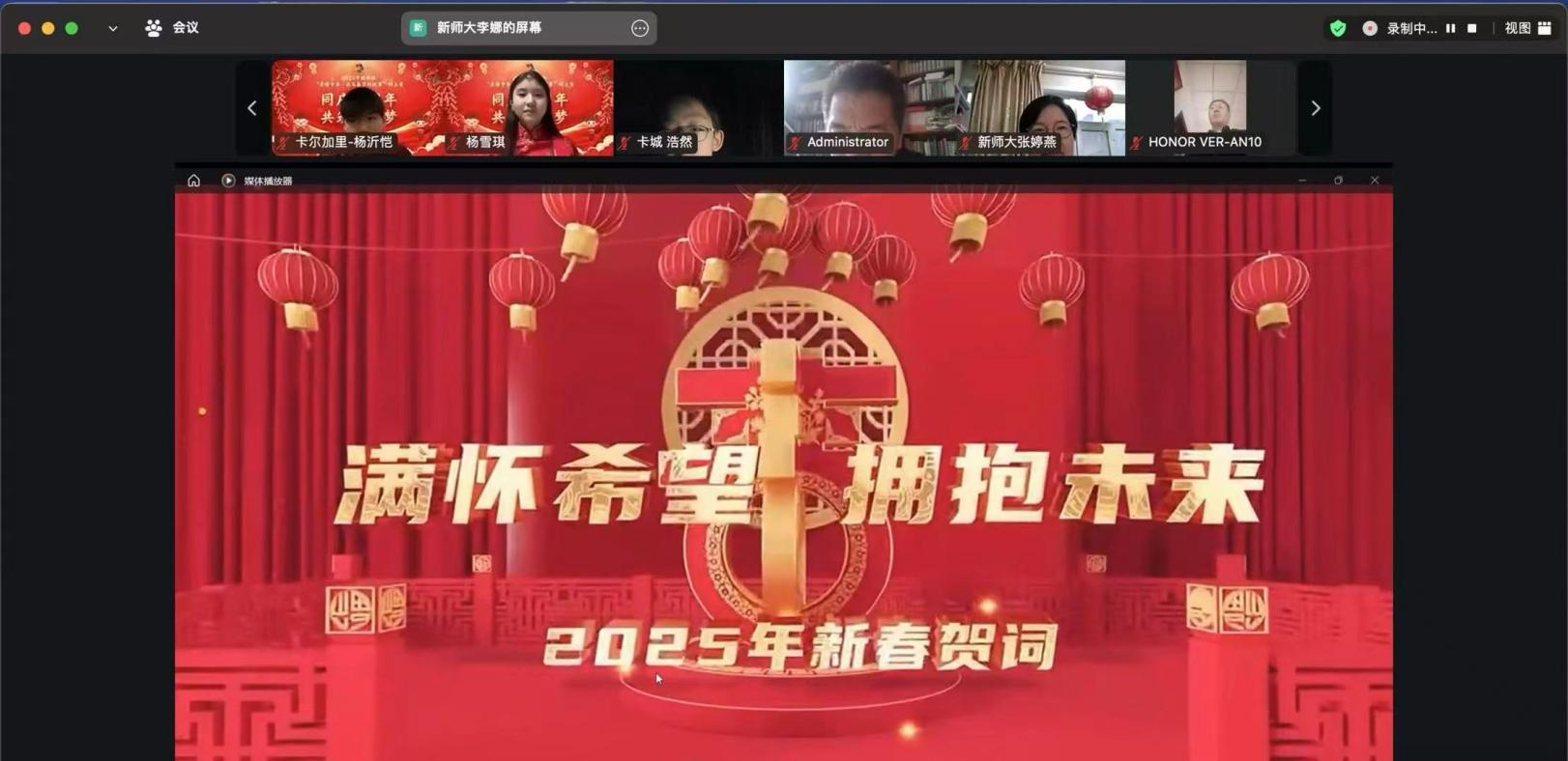 首先,嘉宾与师生共同观看和聆听了中国侨联万立骏主席的新年致辞。万立骏主席表达了对广大侨胞的深切关怀和美好祝愿,指出侨联将始终坚持为侨服务,关心关注侨胞所思、所想、所期、所盼,当好桥梁纽带,并激励侨胞们满怀希望、拥抱未来,共同迎接阳光普照、欣欣向荣的新一年。随后,王艳校长表达了对活动的热烈祝贺,指出本次活动不仅是在传播中国文化,更是在播撒文化认同的种子。西班牙博思语言学校官小渤老师通过视频发表了感言,希望孩子们通过活动了解春节、了解中华文化,了解新疆之美、新疆之大、新疆之奇。加拿大Link CC青年会首席执行官Elina Yuan、特别活动副总裁杨雪琪代表营员分享了自己对中华文化的理解和热爱,以及对此次文化体验的满心期待。
