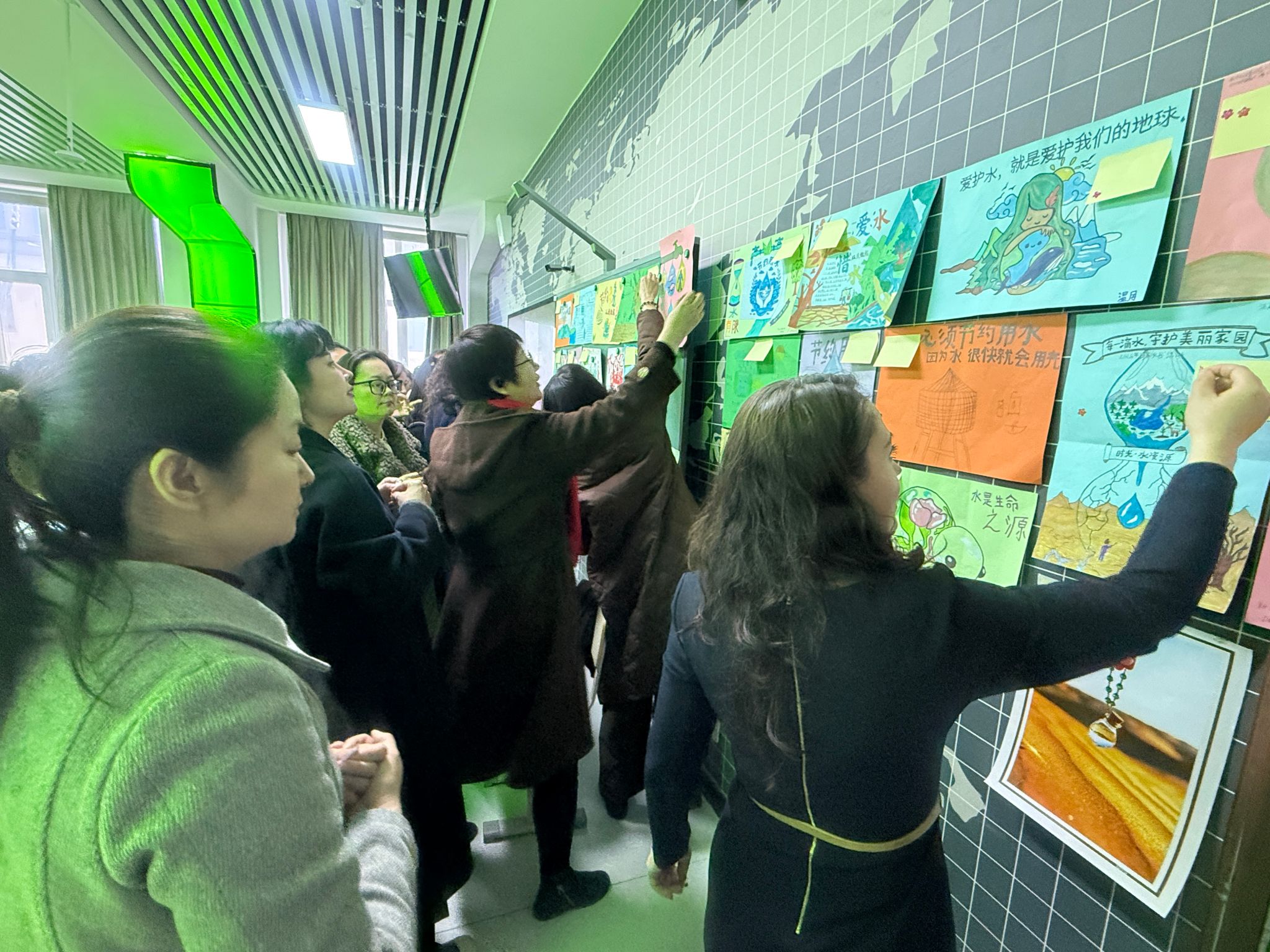 本次活动是教师党支部探索主题党日与学院专业特色有效结合的一次积极尝试。立足学院教育实际,支部充分发挥专业教师资源优势,将环保主题宣传融入学生第二课堂,特别是引导留学生在创作实践中提升语言表达、文化理解与审美素养,推动思政教育从课堂延伸至课外,实现润物无声的育人效果。活动启动后,中外学子尤其是来华留学生踊跃参与,紧扣节水护水主题,将各国文化元素、自然生态图景、节水标语与日常生活场景巧妙融合,创作出一幅幅主题鲜明、形式多样的海报作品,生动展现了各国青年携手守护地球家园的共同愿景。评比环节中,教师党支部组织全院教师组成评审小组,以“贴小红花”的形式进行公开评选,最终评选出特等奖、一等奖、二等奖、三等奖及优秀奖若干名。优秀作品在学院宣传栏集中展示,有效传递了节水护水理念。