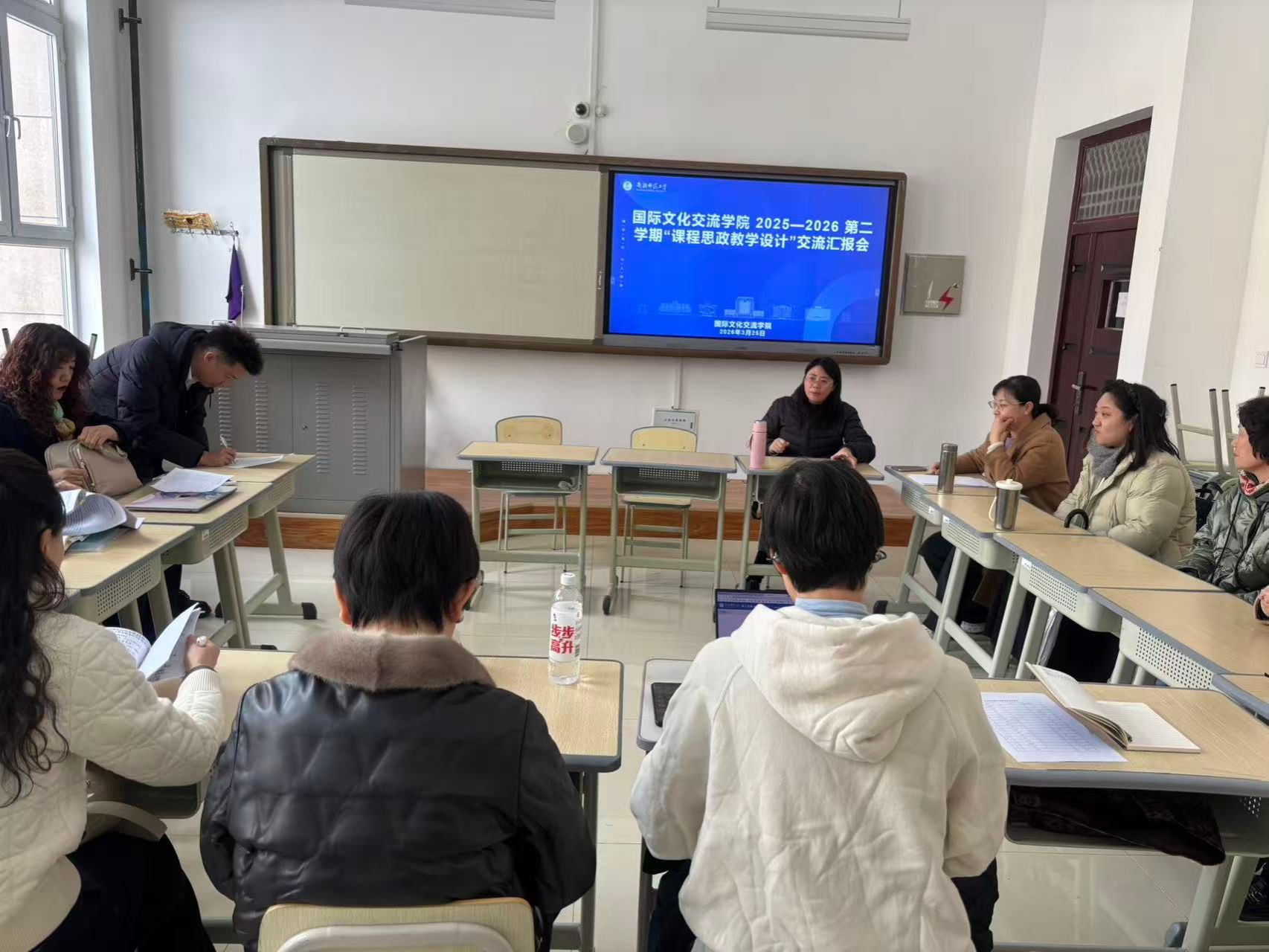 在1号教学楼112教室举行2025—2026学年第二学期“课程思政教学设计”交流汇报会。汉语国际教育系全体教师及教学管理人员参会,会议由系主任胡炯梅教授主持。