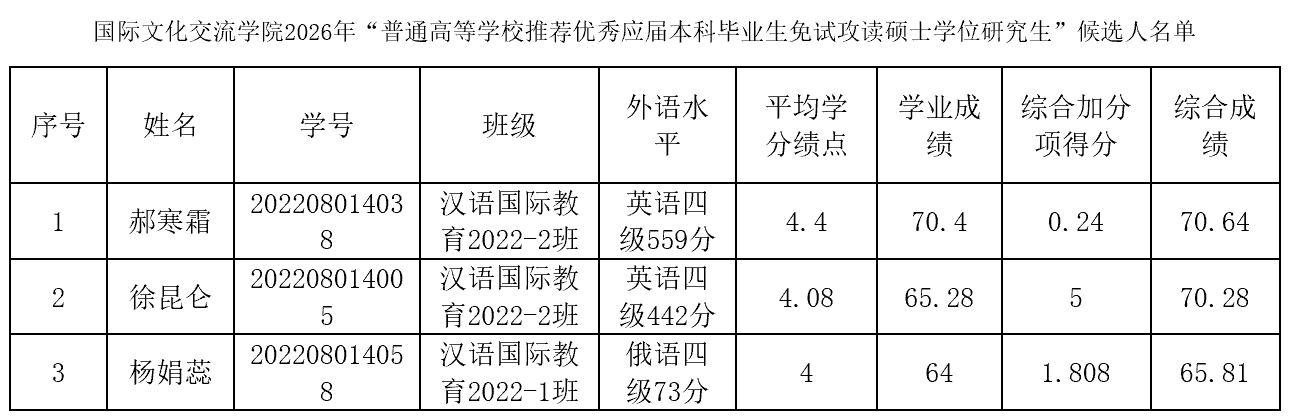 2026年优秀应届本科毕业生免试攻读硕士学位研究生的候选人予以公示,具体如下: