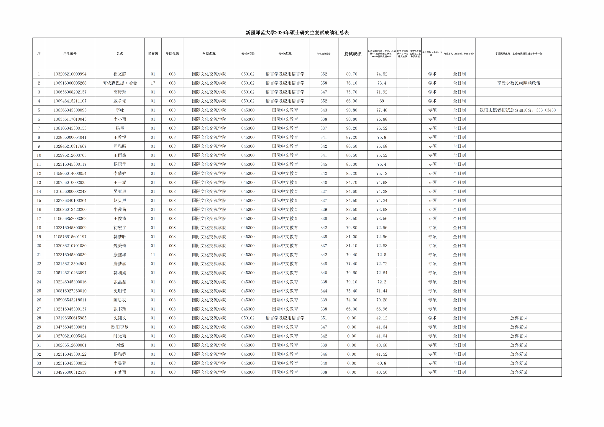 亚洲色情 国际文化交流学院2026年硕士研究生招生调剂复试工作已结束,现将成绩予以公示如下: