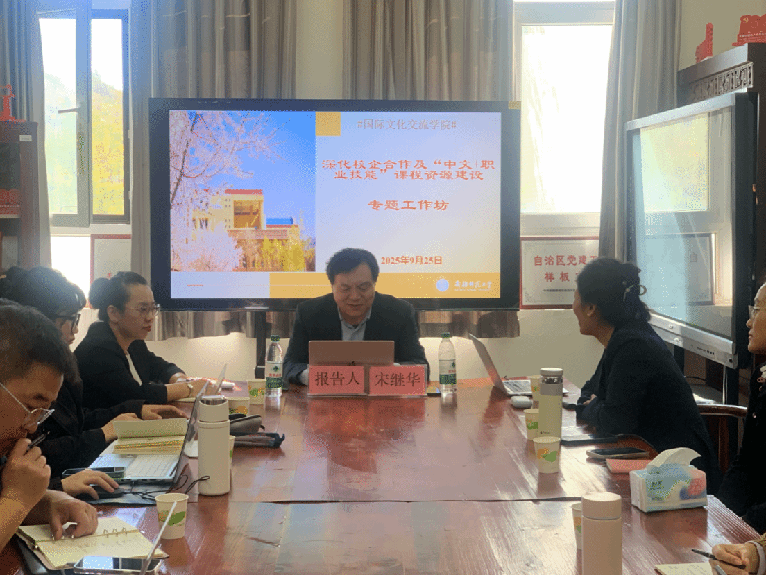 于文科5号楼106室成功举办“深化校企合作及‘中文+职业技能’课程资源建设”专题工作坊。活动特邀北京师范大学宋继华教授担任主讲嘉宾,学院教师及研究生共同参与。