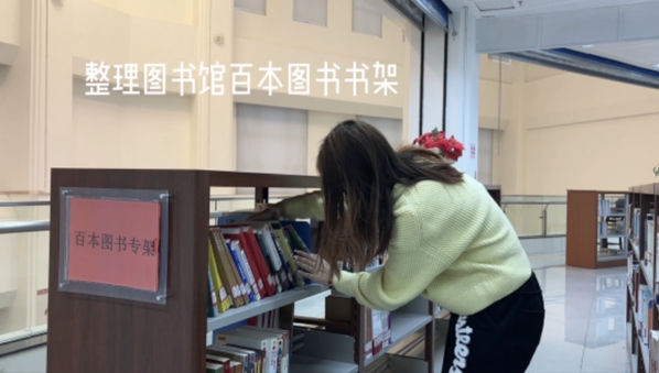 甄雪岩整理图书馆百本图书书架